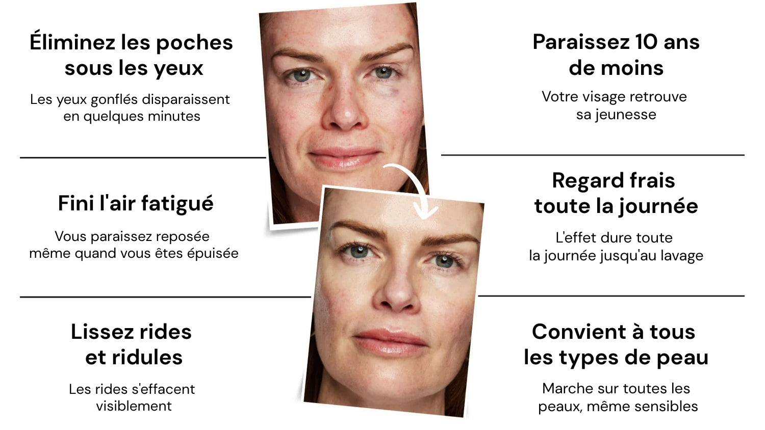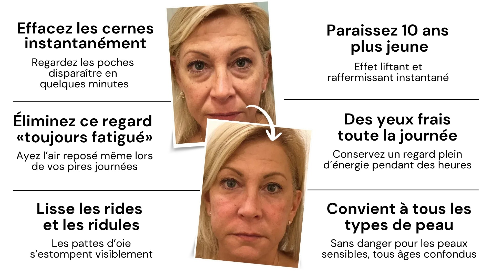 100% des utilisatrices ont constaté une réduction des poches en seulement 3 minutes (étude clinique réalisée auprès de 25 femmes âgées de 36 à 65 ans).